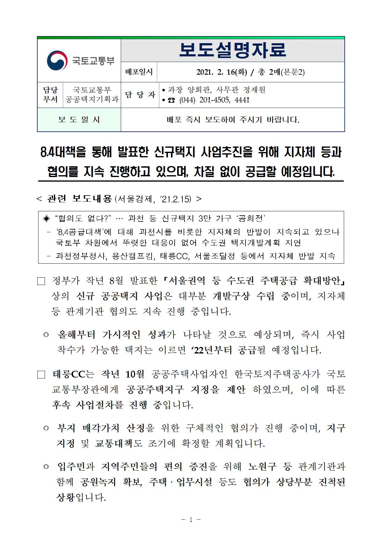 210216(설명)8.4대책을 통해 발표한 신규택지 사업추진을 위해 지자체 등과 협의를 지속 진행하고 있으며_차질 없이 공급할 예정입니다(공공택지기획과).pdf