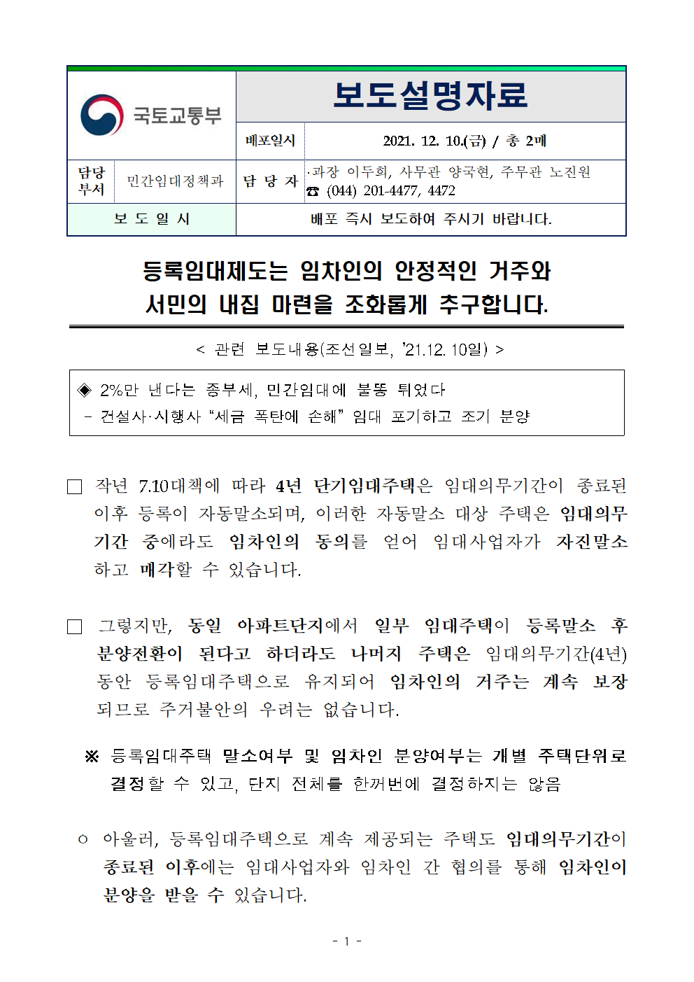 | [보도설명] 임대차 신고제를 통해 갱신요구권 행사 등 임차인의 주거안정이 확인되고 있습니다 (0) | 2021.12.22 |