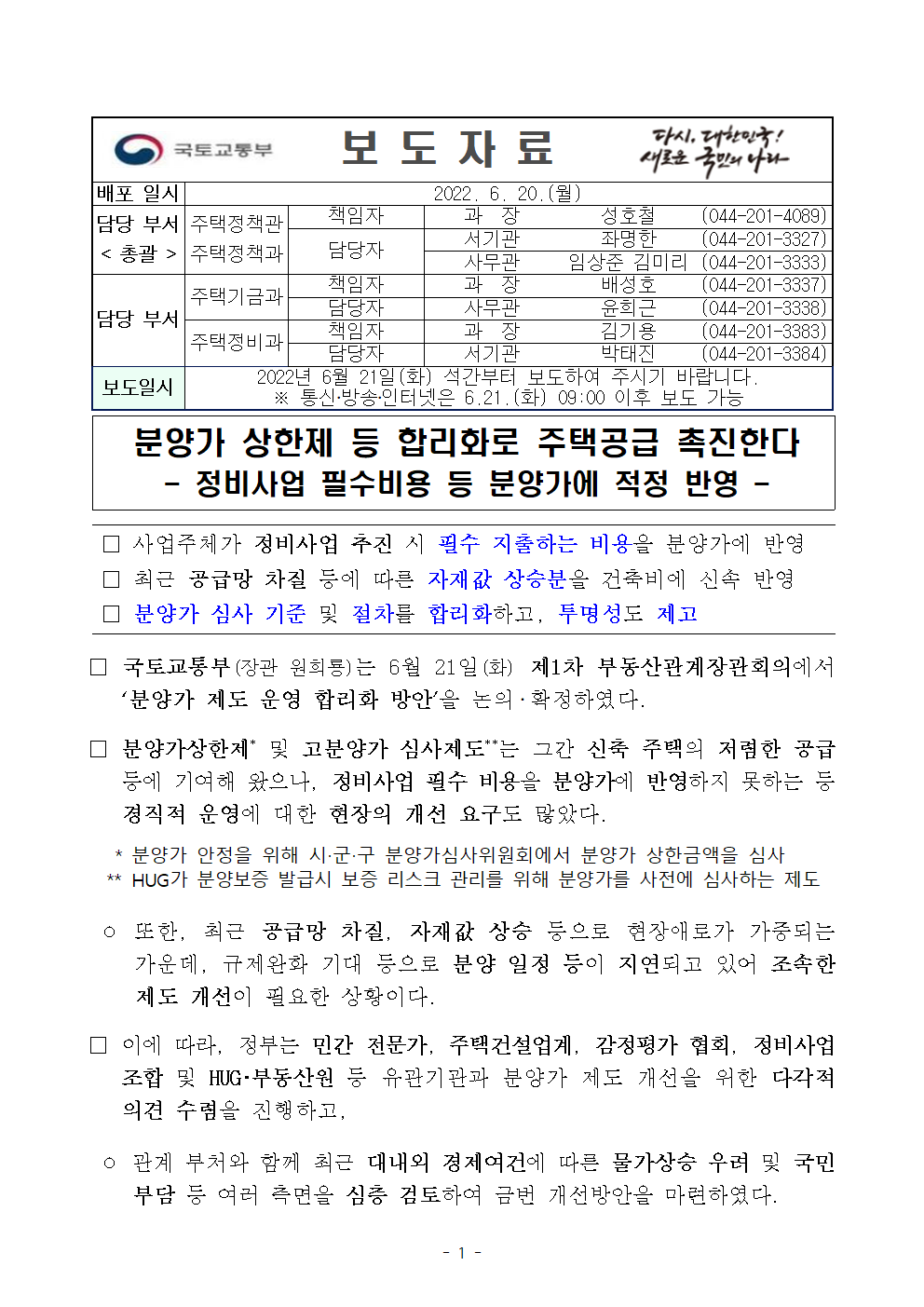 | [보도자료] 제1차 부동산 관계장관회의 개최, 임대차 시장 안정 방안 및 3분기 추진 정상화 과제 발표 (0) | 2022.06.22 |